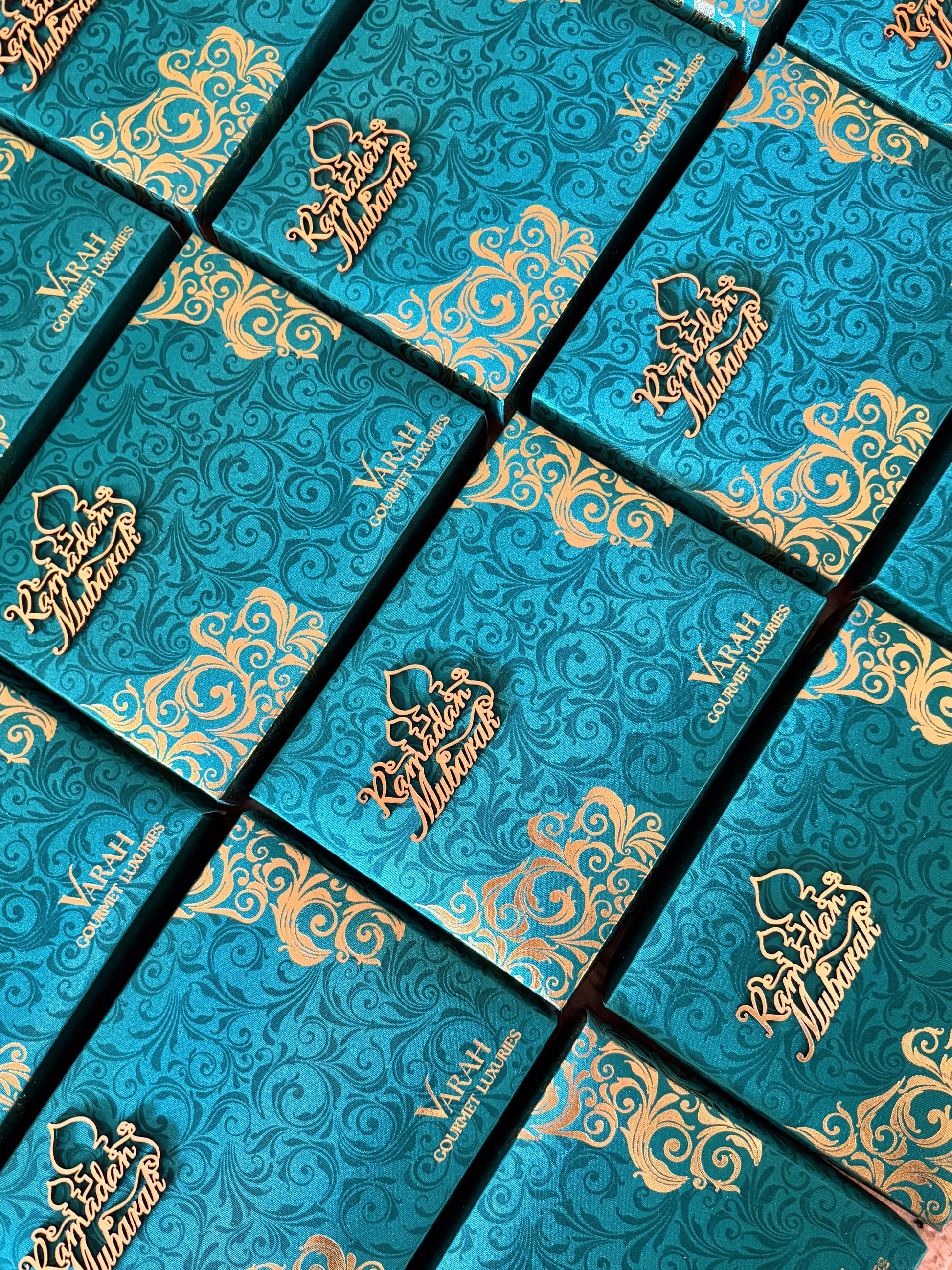 This Ramadan, we've decorated our gold foiled boxes with a golden 'Ramadan Mubarak' golden wooden lasercut greeting.